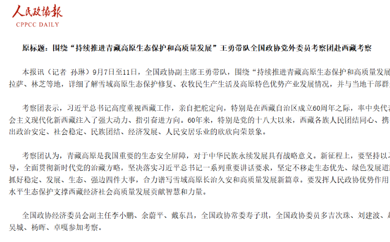 9月7日至11日,全國政協(xié)副主席王勇帶隊,圍繞“持續(xù)推進(jìn)青藏高原生態(tài)保護和高質(zhì)量發(fā)展”...